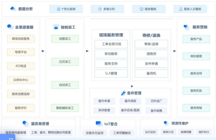 (1)服务营销一体化:通过维保合同管理、增值服务推荐、备件营销等功能,推动客服部门从成本中心向利润中心转型。